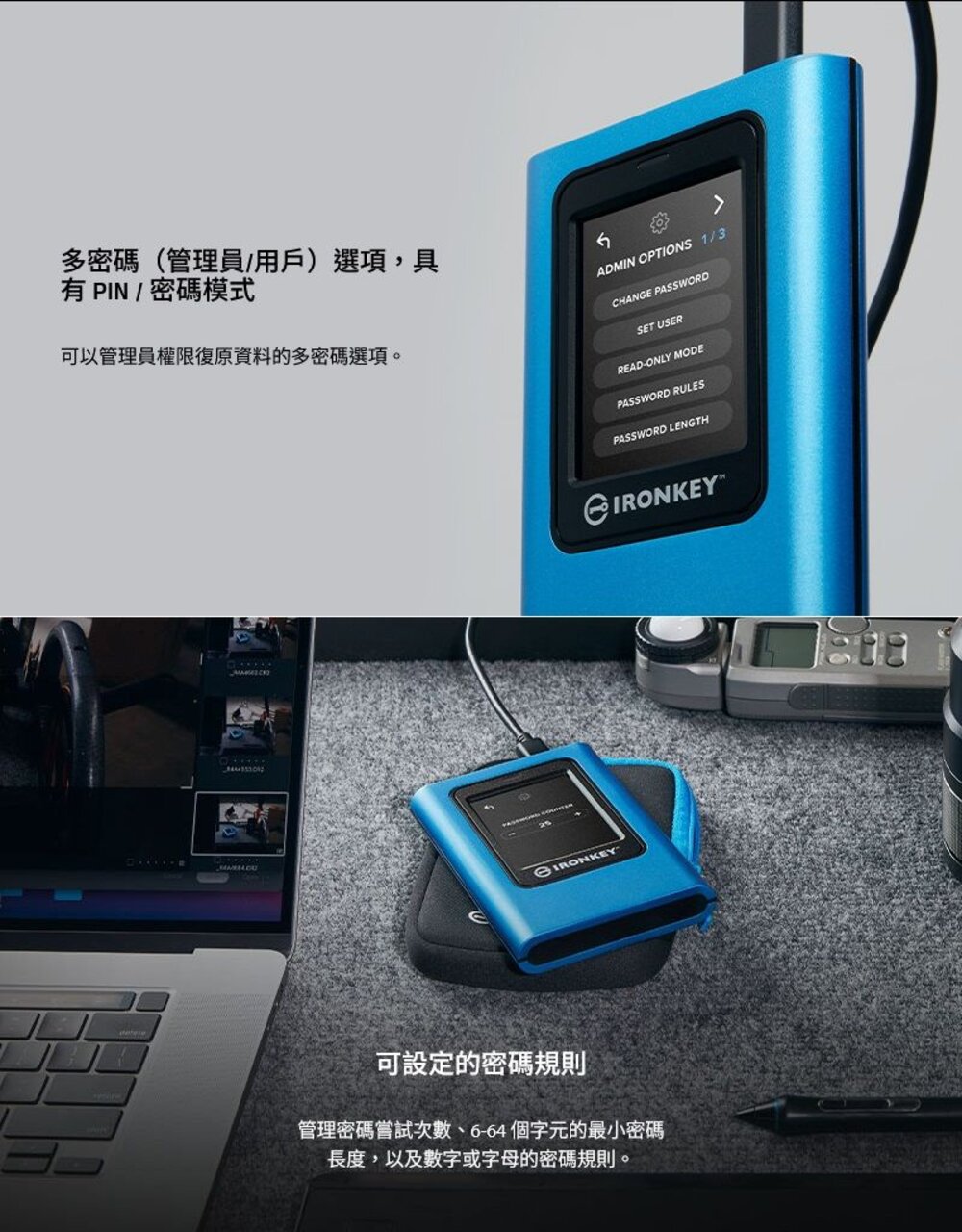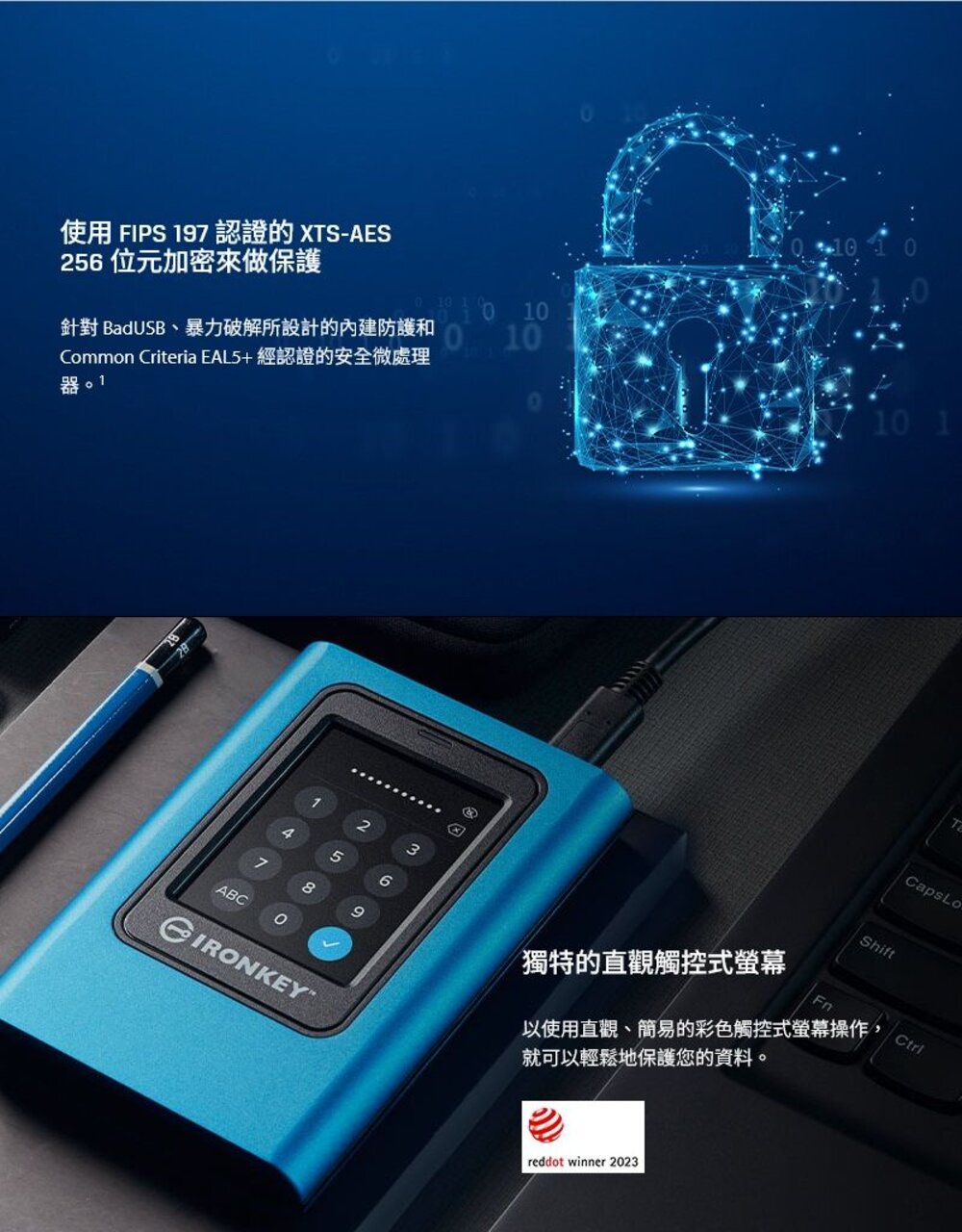 Kingston IronKey™ Vault Privacy 80 此款外接固態硬碟可用於資料保護,是金士頓首款獨立於作業系統且具備觸控式螢幕的外接式硬體加密固態硬碟。 VP80ES 可抵擋暴力破解BadUSB並具有數位簽名的韌體程式。 在預設情況下,如果管理員和用戶連續輸入 15 次1錯誤密碼,則會透過加密方式刪除硬碟資料。 該硬碟經 FIPS 197 認證,具備 XTS-AES 256 位元加密,使用 Common Criteria EAL5+ (CC EAL5+) 經認證的安全微處理器,並且符合 TAA 規範。