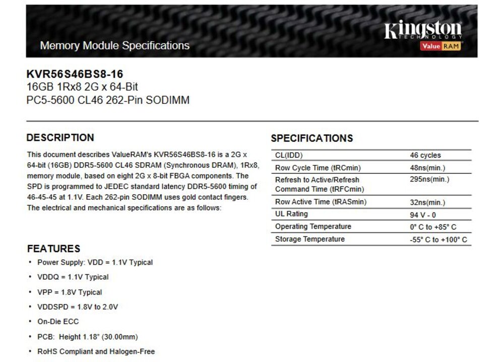 16GB DDR5 5600MT/s Non-ECC Unbuffered SODIMM CL46 1Rx8 1.1V 262-pin 16Gbit