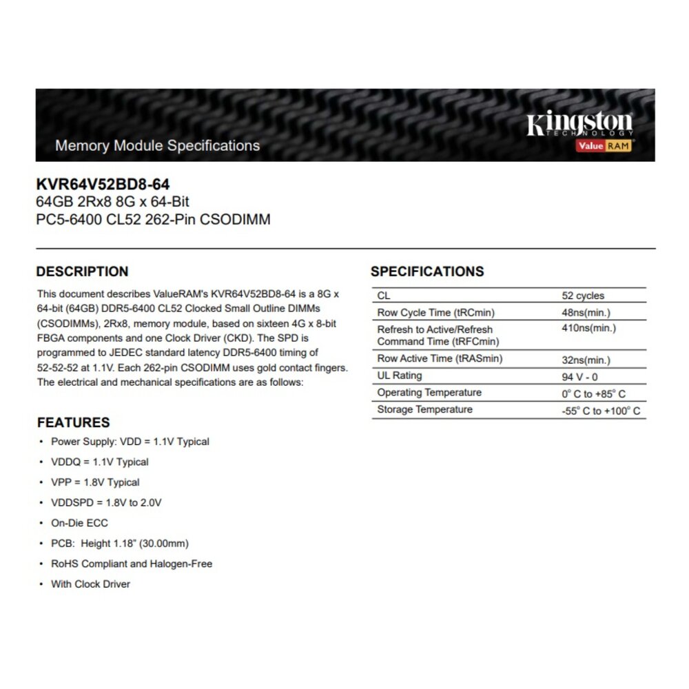 64GB DDR5 6400MT/s Non-ECC Clocked Unbuffered SODIMM