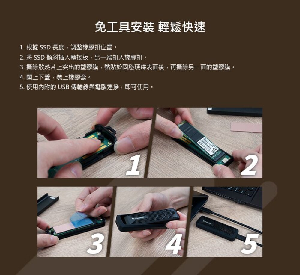 包裝內容:外接盒/散熱片/橡膠扣/橡膠套/USB Type-C 轉 Type-C 傳輸線/USB Type-C 轉 Type-A 傳輸線/快速使用手冊"
