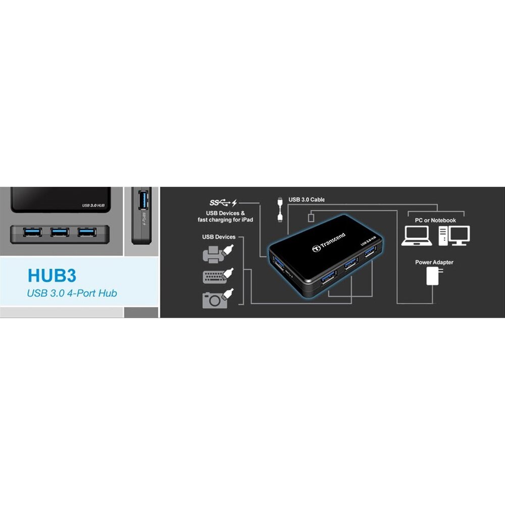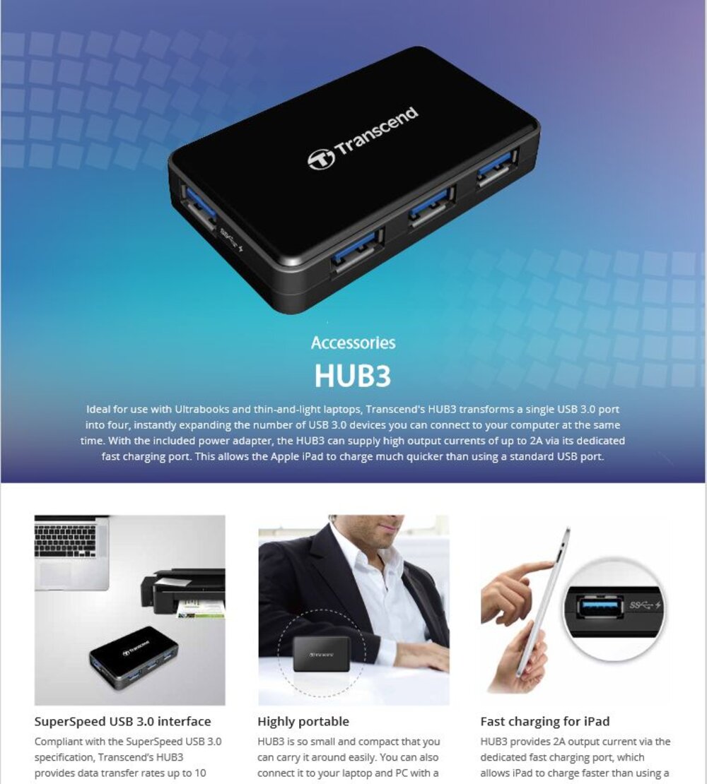 創見HUB3集線器擁有四個USB 3.1 Gen 1埠,能瞬間擴充連接裝置的數量,是輕薄筆電與Ultrabook的最佳拍檔。