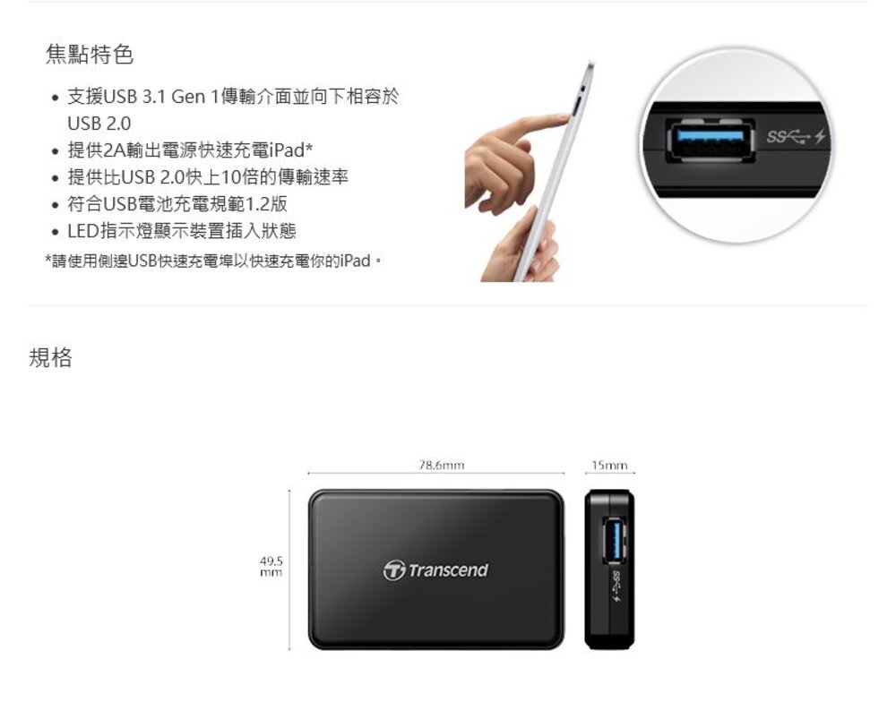 此外,創見HUB3具備專屬的USB快速充電埠,搭配使用內附的電源轉換器,即可支援2A輸出電源,比起用標準USB埠充電,能大幅縮短iPad的充電時間。
