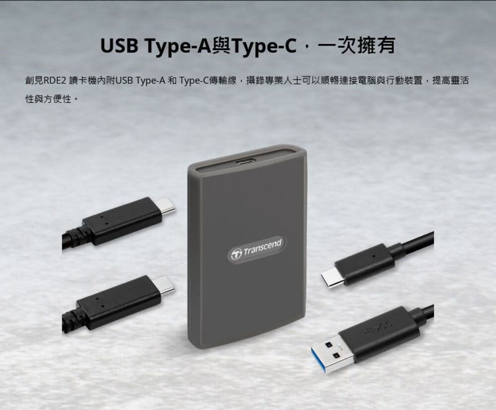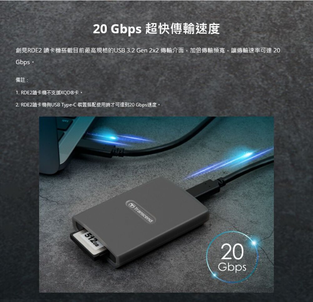 備註 RDE2讀卡機不支援XQD®卡。RDE2讀卡機與USB Type-C 裝置搭配使用時才可達到20 Gbps速度。"
