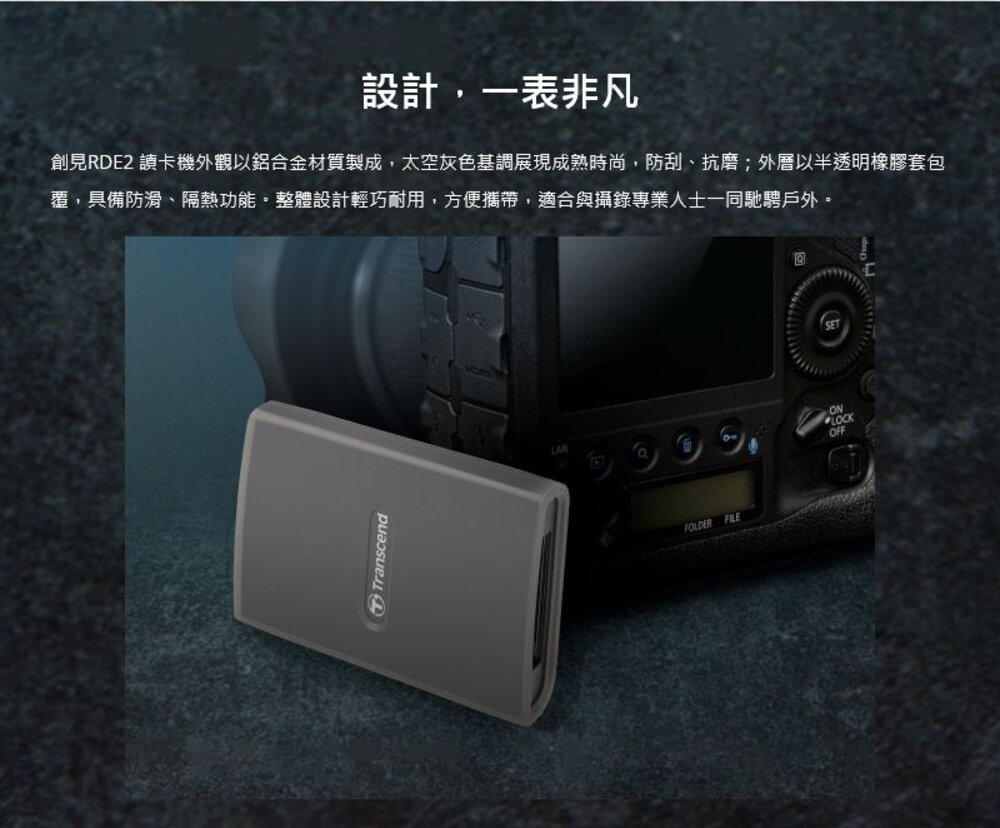 創見的CFexpress Type B RDE2 讀卡機專門為攝錄專業人士所使用的CFexpress 記憶卡所設計,搭載USB 3.2 Gen 2x2傳輸介面,傳輸速率高達20 Gbps,有效滿足專業人士大量高速的傳輸需求。RDE2 讀卡機可同時支援USB Type-A和Type-C連接埠裝置,充分展現方便性與靈活性。輕巧的鋁合金噴砂外殼由止滑橡膠套包覆不僅加強耐用度,更攜帶方便,是專業玩家的理想選擇。