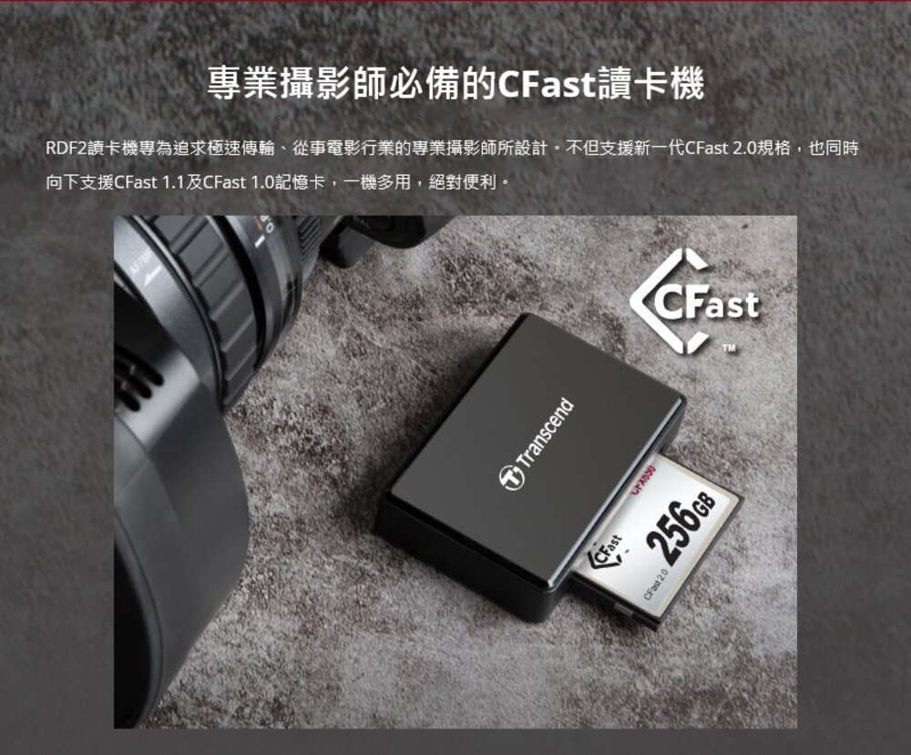 創見RDF2 CFast 2.0 讀卡機是專為從事電影行業並使用CFast記憶卡的專業攝影師所設計,完全滿足追求極速傳輸的需求。RDF2內建極速USB 3.1 Gen 1傳輸介面,同時向下相容USB 2.0,展現優異傳輸速度,可有效替專業人員省下傳輸大量高解析度影音檔的惱人時間,而全心全意專注在拍攝上。RDF2輕便小巧的外型設計,讓使用者來回工作室及拍攝現場時也能隨身攜帶,不帶來任何負擔。