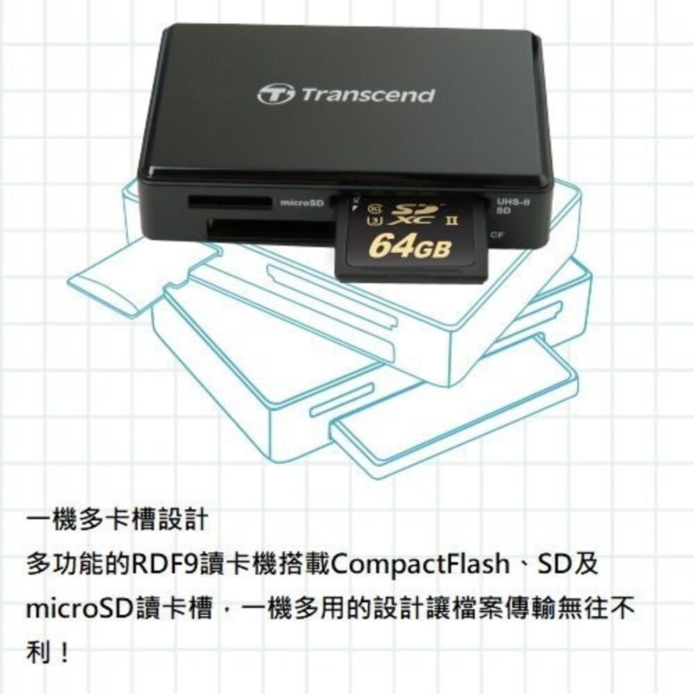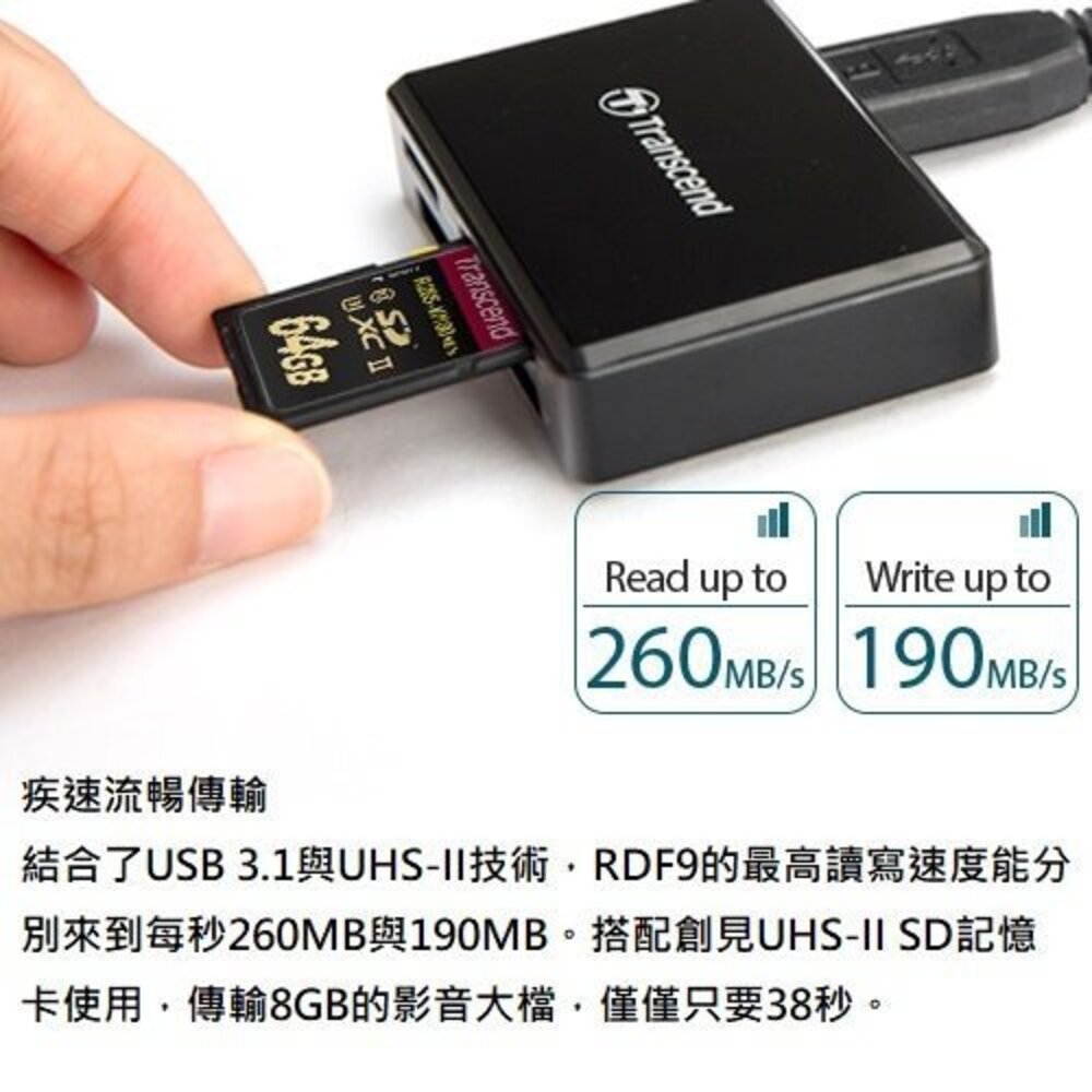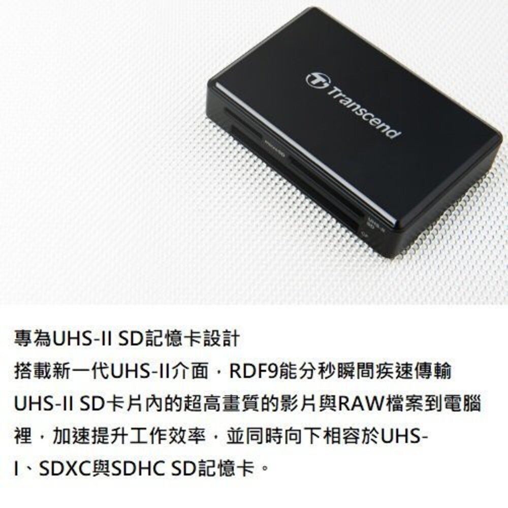 創見RDF9 UHS-II讀卡機專為新一代UHS-II SDXC/SDHC記憶卡所設計,能全面釋放其記憶卡的高速傳輸效能。