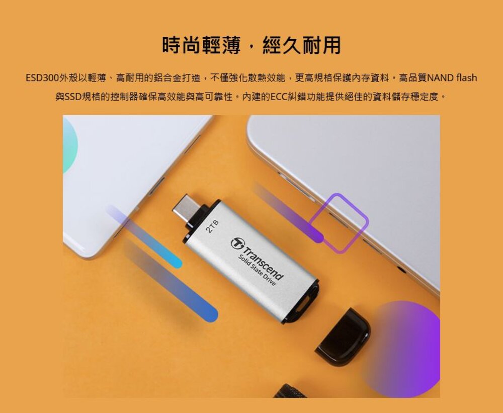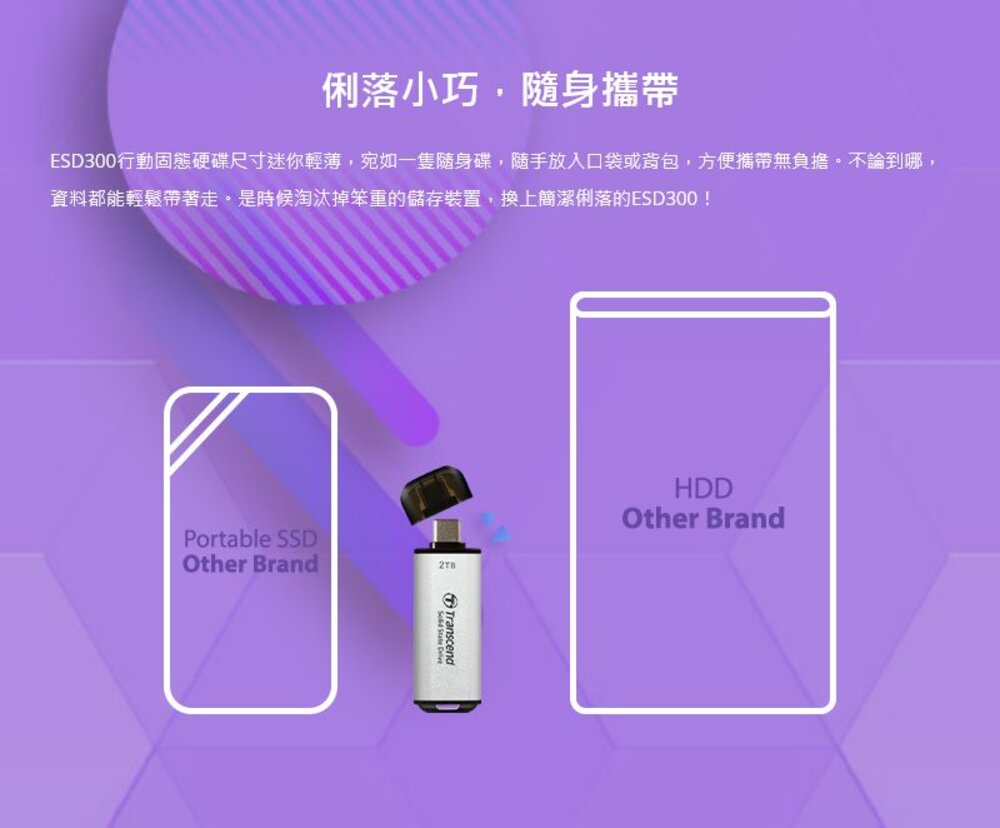 ESD300超迷你行動固態硬碟以10Gbps超高速傳輸嶄露頭角,可儲存高達2TB的多媒體檔案與遊戲資料,海量文件可在轉瞬間傳輸完畢,縮短等候時間。ESD300支援USB Type-C裝置,高耐用與高相容特性充分滿足日常所需。