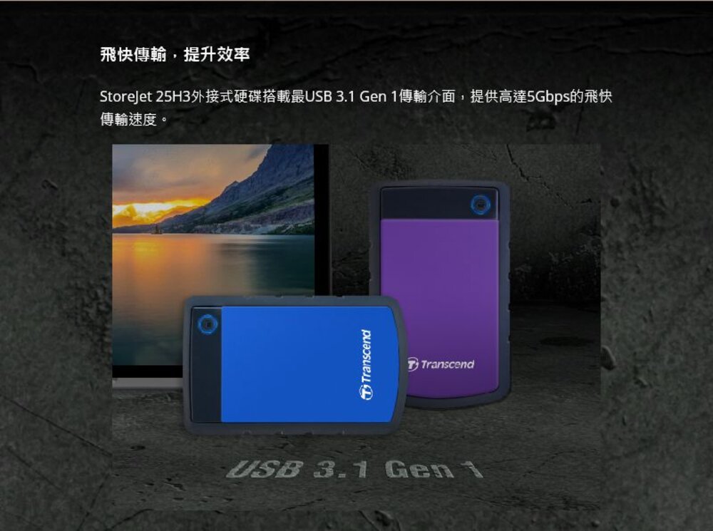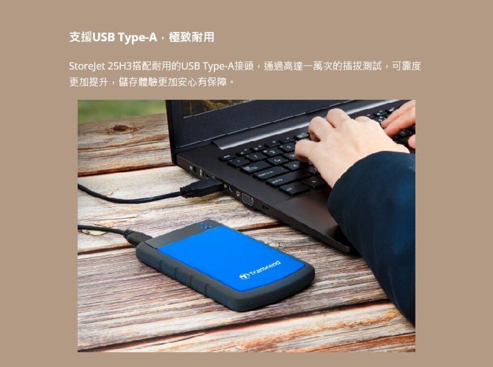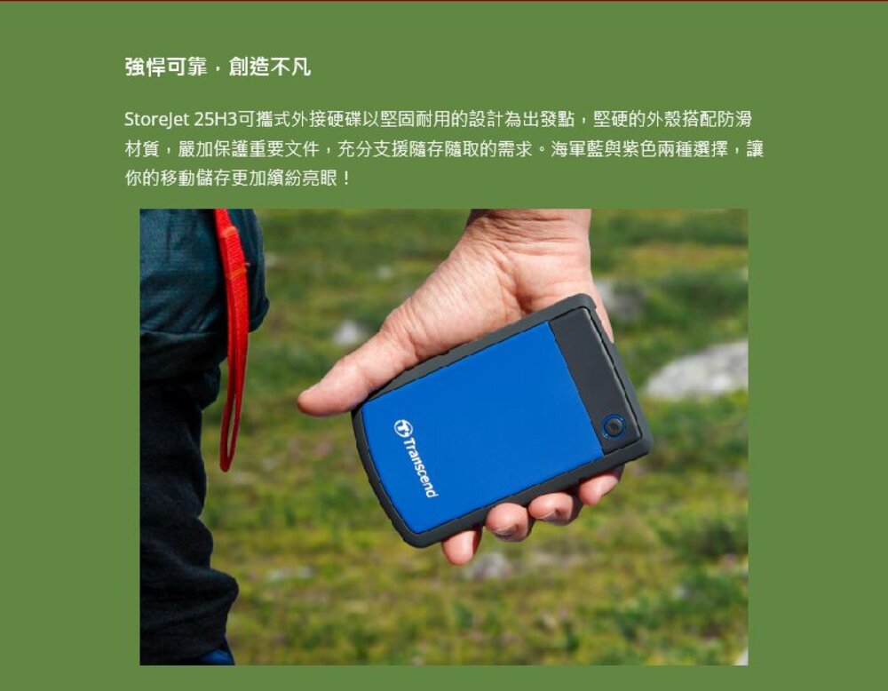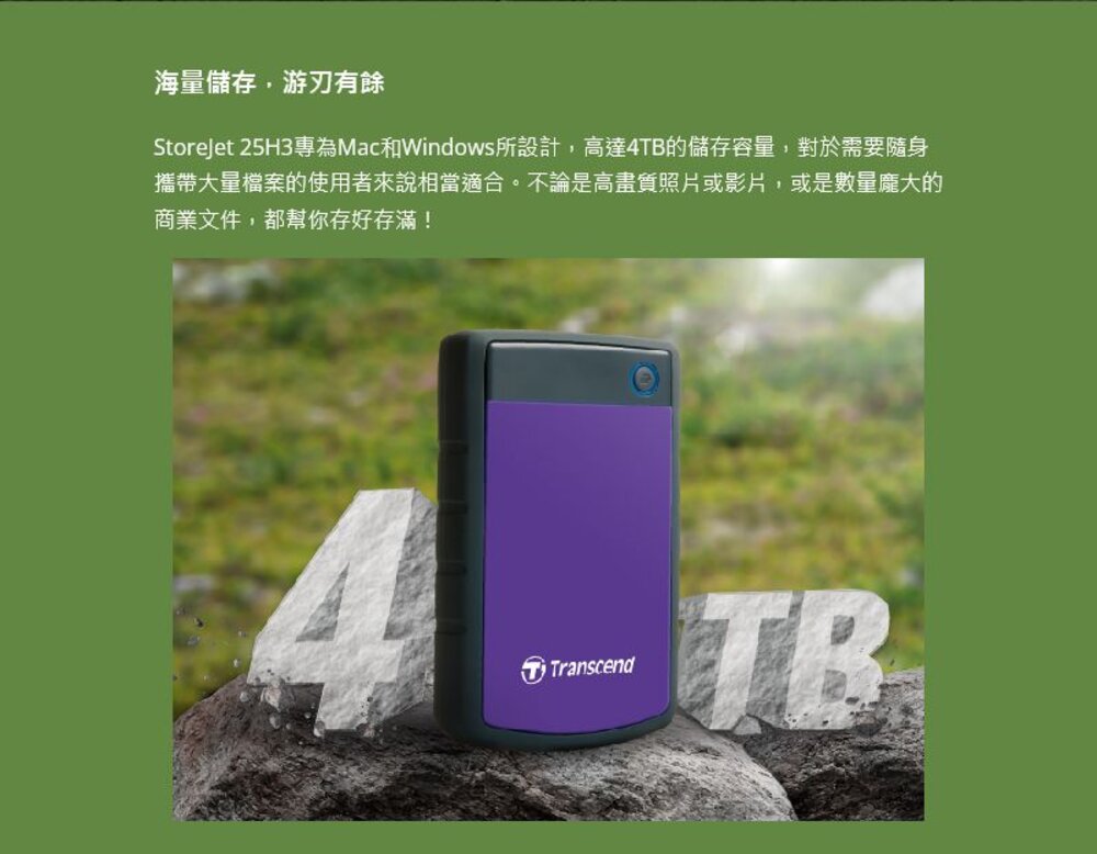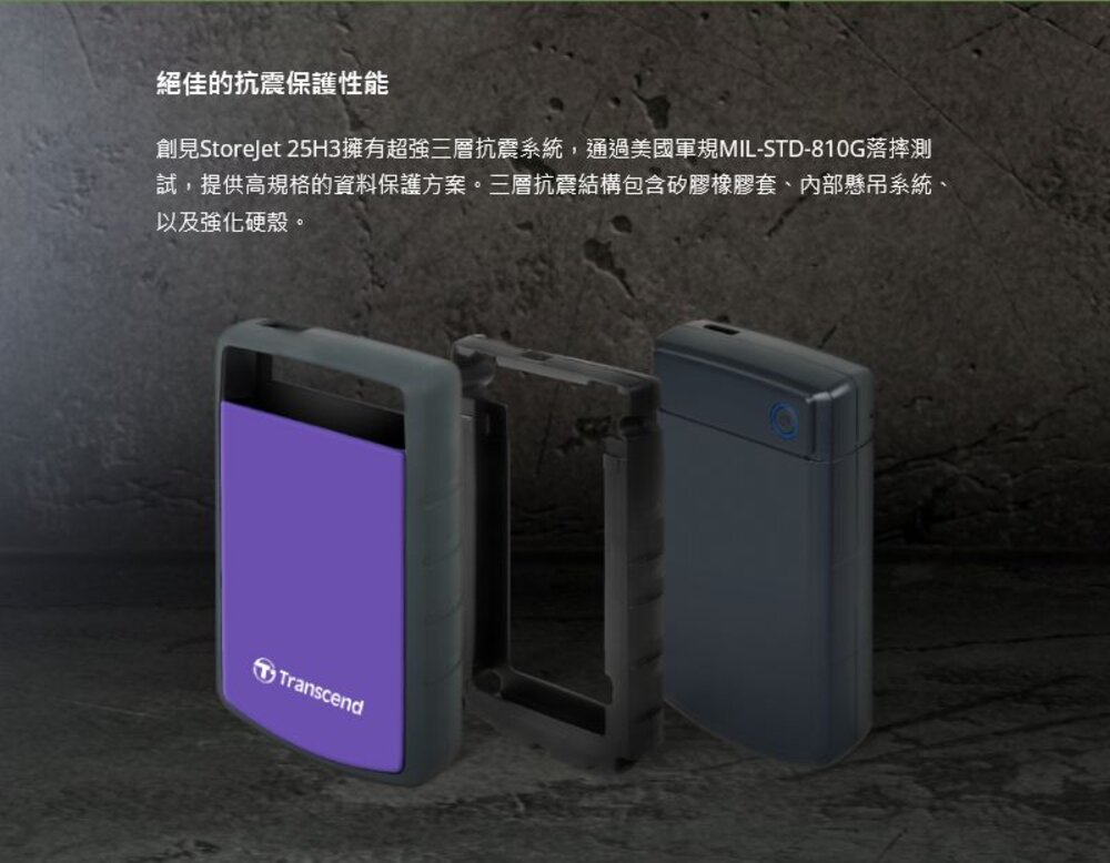 創見StoreJet 25H3可攜式外接硬碟結合頂級抗震性能與USB 3.1 Gen 1傳輸介面,讓你在享受高速檔案傳輸的同時,也能體驗軍規級防護,感受尖端科技帶來的傳輸新境界!高達4TB的超大儲存空間更滿足你想要暢所欲為地儲存檔案的需求。