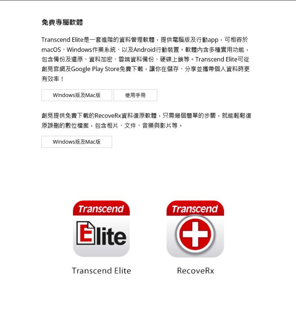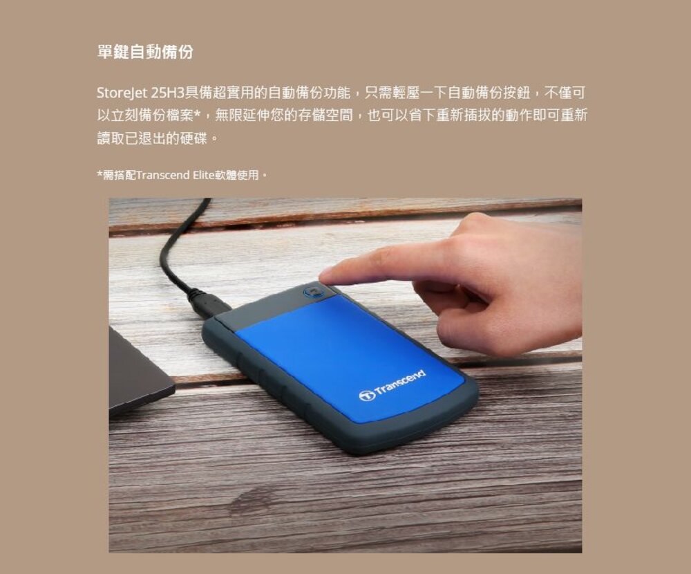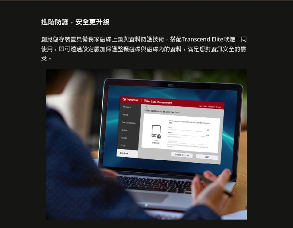 備註:單鍵自動備份與AES資料加密功能需搭配Transcend Elite軟體使用。